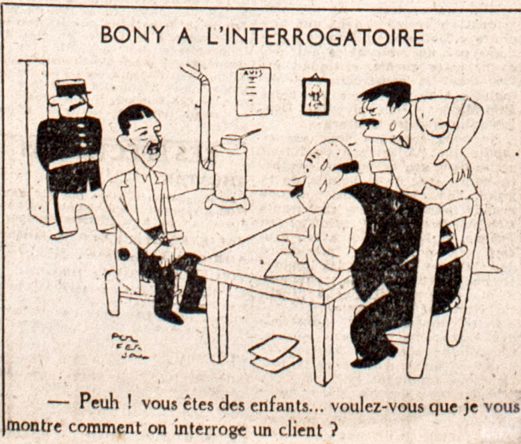 Caricature publiée dans Le Franc-Tireur en septembre 1944, intitulée Bony à l’interrogatoire. Légende : « Peuh ! Vous êtes des enfants… voulez-vous que je vous montre comment on interroge un client ? »